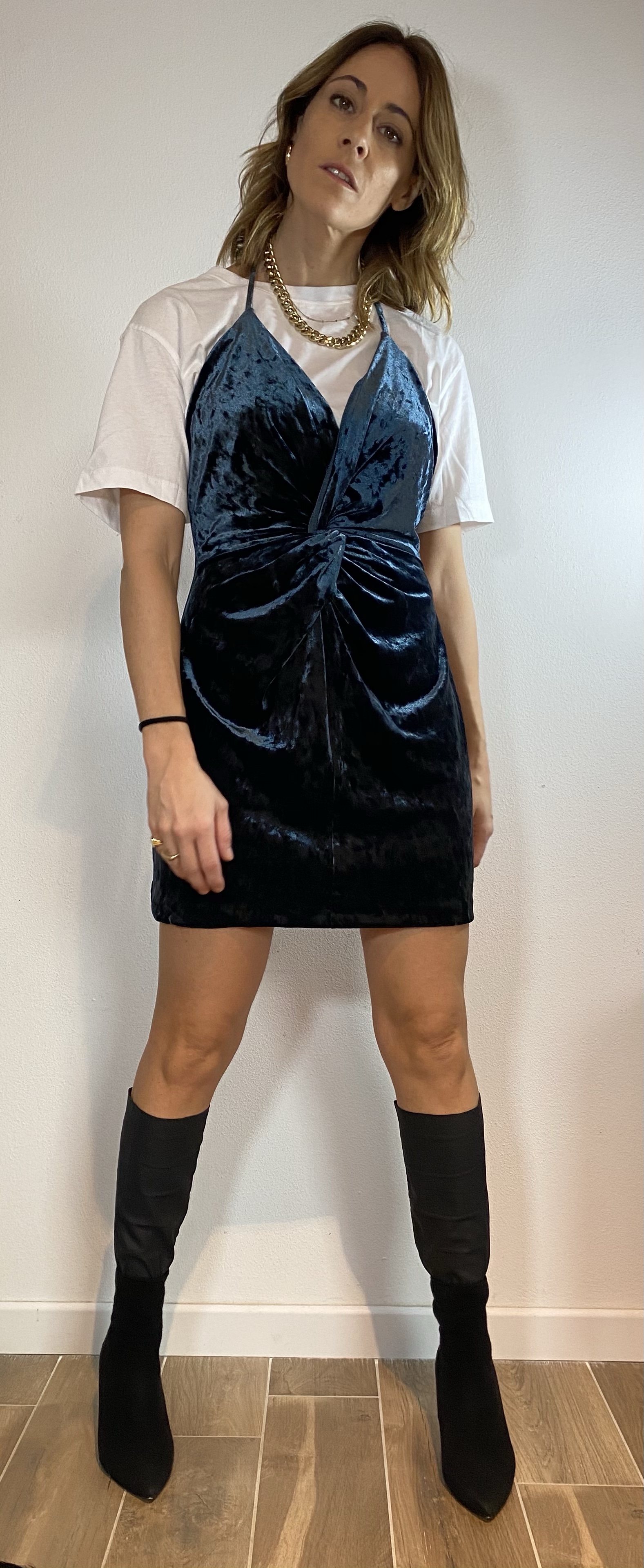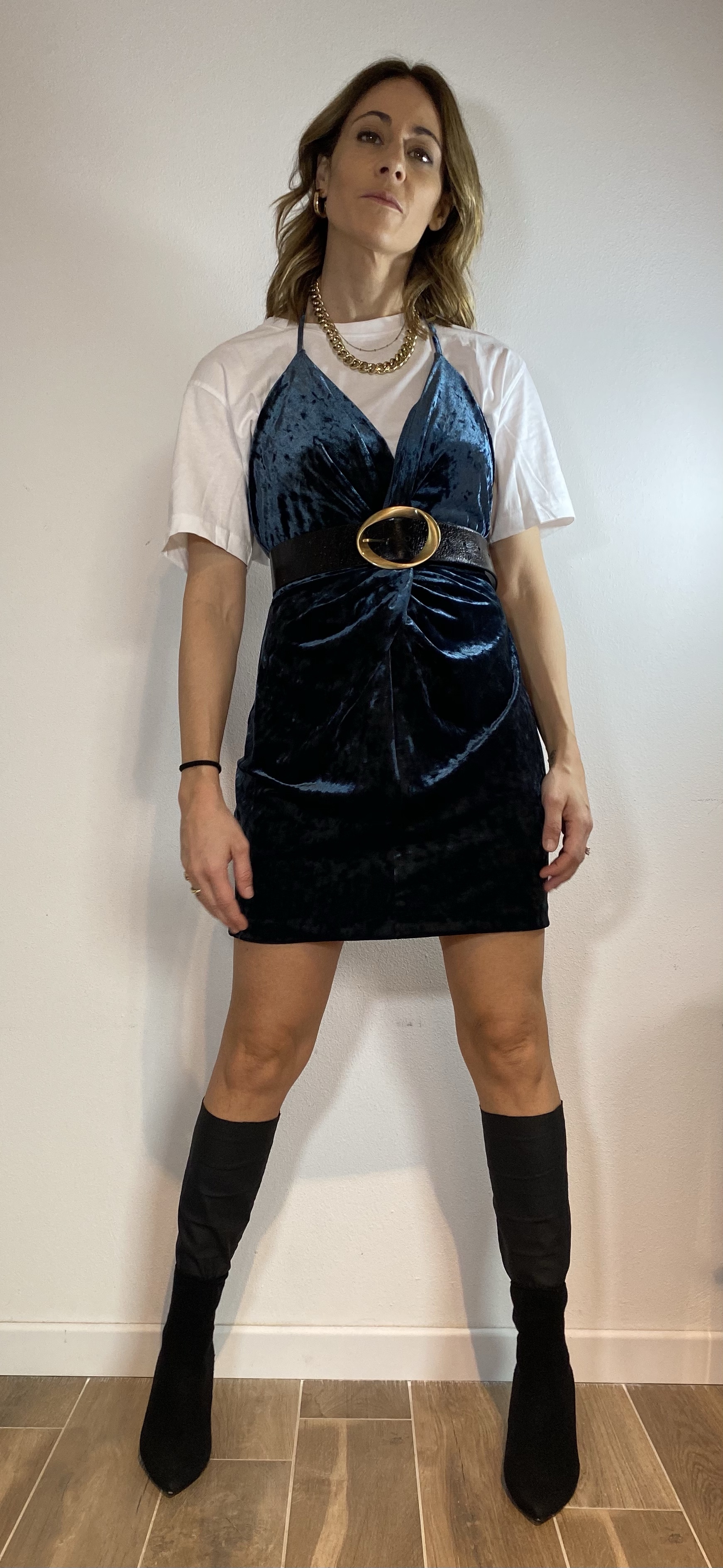 -con t-shirt sotto per renderlo più sbarazzino e svariati accessori oro