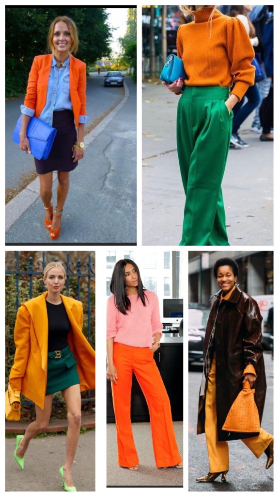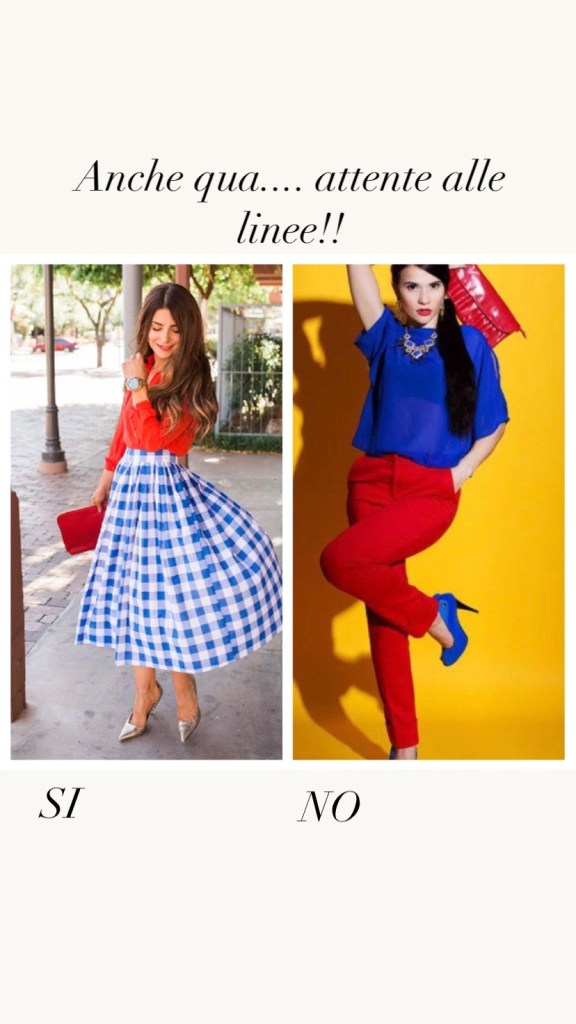 Fondamentale per l’accostamento di due colori sono le linee, se già due colori sono complicati da mettere assieme più sbagli anche la linea di questi potresti combinare un pasticcio di outfit, perciò nell’indecisione o nel dubbio non mescolate troppi colori, ma al massimo usatene due, addirittura vestite monocolore o con colori base e osate nella scarpa o nella borsa.